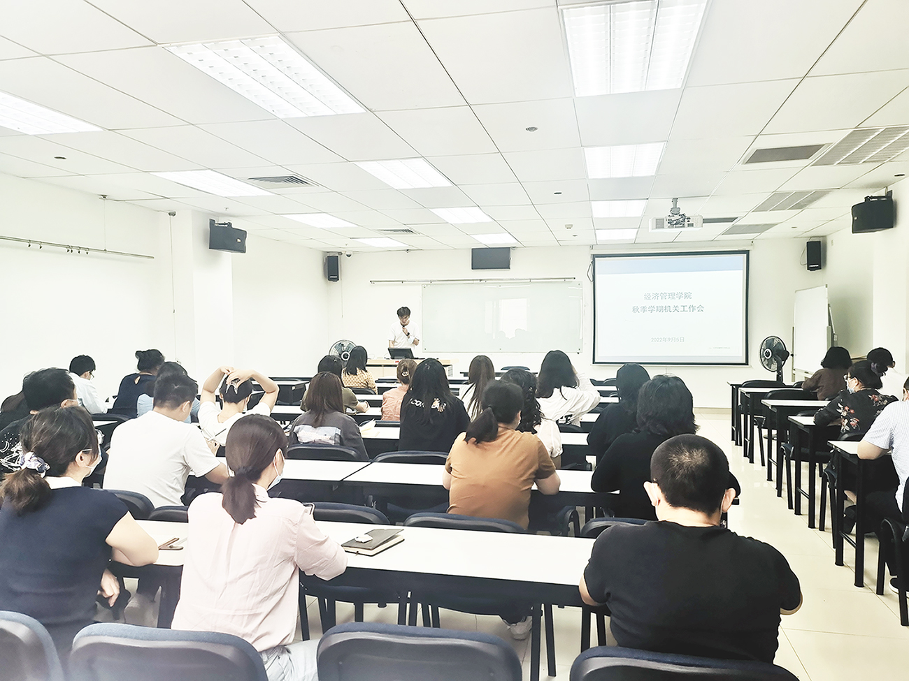 2022年9月5日中午,9999js金沙老品牌在新主楼A928召开机关工作会暨管理创新专项基金宣讲会。会上,学院党政办公室郝乙主任传达学校2022年暑期工作会精神,牟晖副院长解读学院机关作风评价调查结果,并就学院新设的管理服务创新专项基金进行介绍。会议由郝乙主任主持,机关行政管理人员近五十人参加。