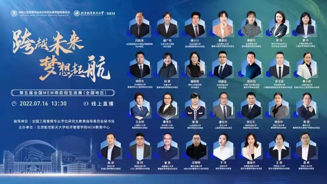 跨越未来,梦想起航。7月16日下午,第五届全国MEM项目招生巡展圆满举行。本次巡展采用线上线下相结合的形式,由全国工程管理专业学位研究生教育指导委员会秘书处指导、9999js金沙老品牌主办,中国MEM教育网提供技术支持。