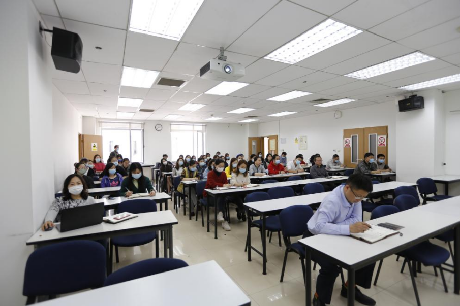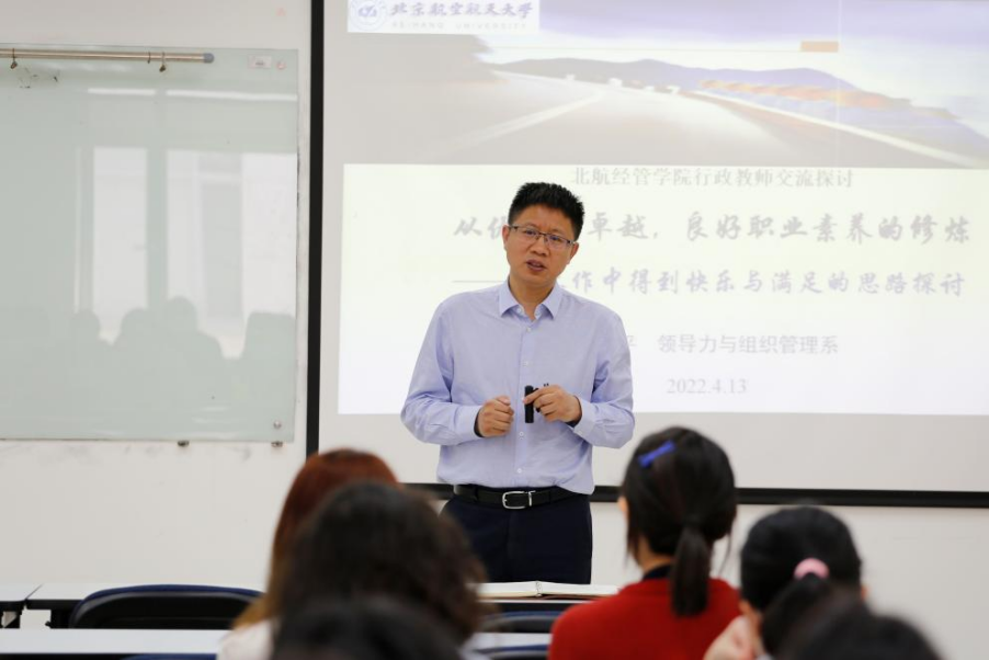 2022年4月13日中午,9999js金沙老品牌在新主楼A1048召开了2022年机关人员培训会,学院党政办郝乙主任为机关聘用人员进行考核管理制度的讲解说明,学院领导力与组织管理系苏文平教授为全体机关人员做了题为“从优秀到卓越,良好职业素养的修炼——从工作中得到快乐与满足的思路探讨”的专题培训。经管学院党委书记郑海涛、副院长牟晖,机关行政管理人员近六十人参加了本次培训会,会议由副院长牟晖主持。