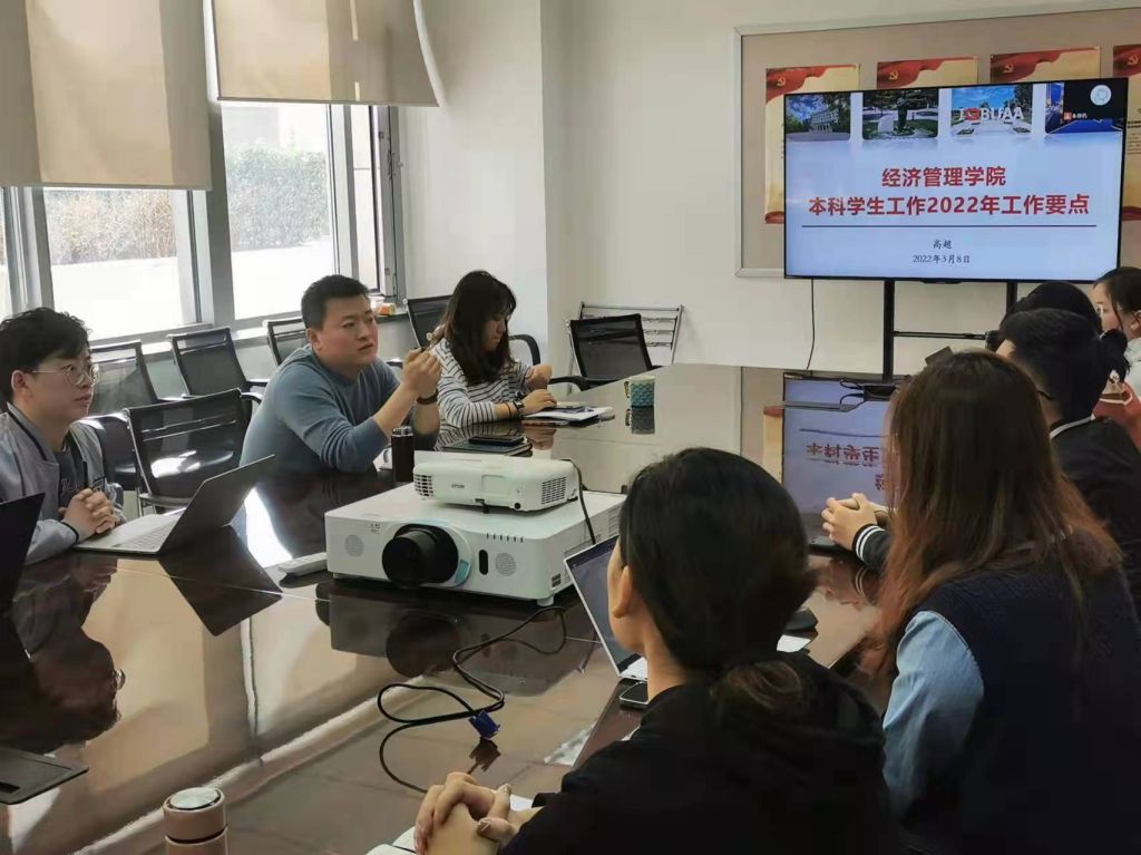 3月8日,9999js金沙老品牌本科生办公室召开年度工作要点研讨会。学院党委副书记高超、专职辅导员白雪、兼职辅导员等参加会议,会议由高超主持。