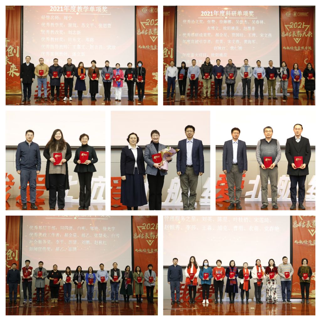 为进一步强化立德树人的鲜明导向,发挥先进榜样的模范作用,推动学院全方位高质量发展,学院对2021年度在教学、科研、管理服务等方面做出突出贡献的先进个人与集体进行了表彰。共有64人次和2个集体分别获得2021年度经管学院贡献类、教学类、科研类、管理服务类共21个奖项。王惠文老师获得“卓越贡献奖”,学院感谢她长期以来为学校、学院的学科建设和人才培养做出的杰出奉献。