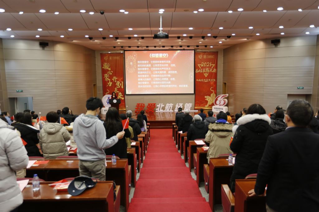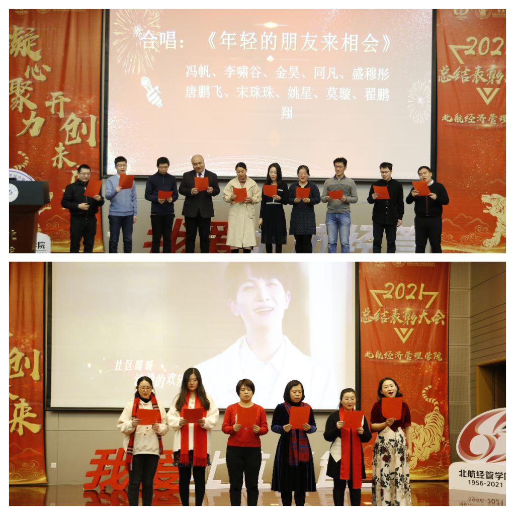 表彰会上,2021年度新进教师带来合唱《年轻的朋友来相会》。他们用奋进的歌词、昂扬的旋律诠释了青年教师蓬勃向上的精神风貌;获得管理服务之星的老师们用一首《灯火里的中国》,展现了学院教工对祖国的美好祝福以及对未来的欣然向往,将现场的热烈气氛推向高潮。最后,全院师生高声合唱北航校歌《仰望星空》,表彰大会圆满落下帷幕。
