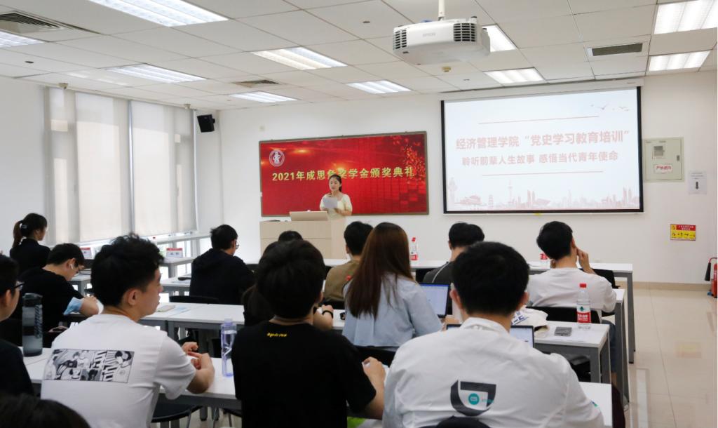 典礼中,与会师生通过视频共同回顾了成思危奖学金的由来。刘志新书记在致辞中介绍了成思危教授在经济管理和教育领域的卓越成就,讲述了他受聘担任经管学院名誉院长之后对学生的关爱和期望,希望大家将奖学金视为激励和鞭策,不断锤炼品格、增长本领,争做德智体美劳全面发展的社会主义建设者和接班人。