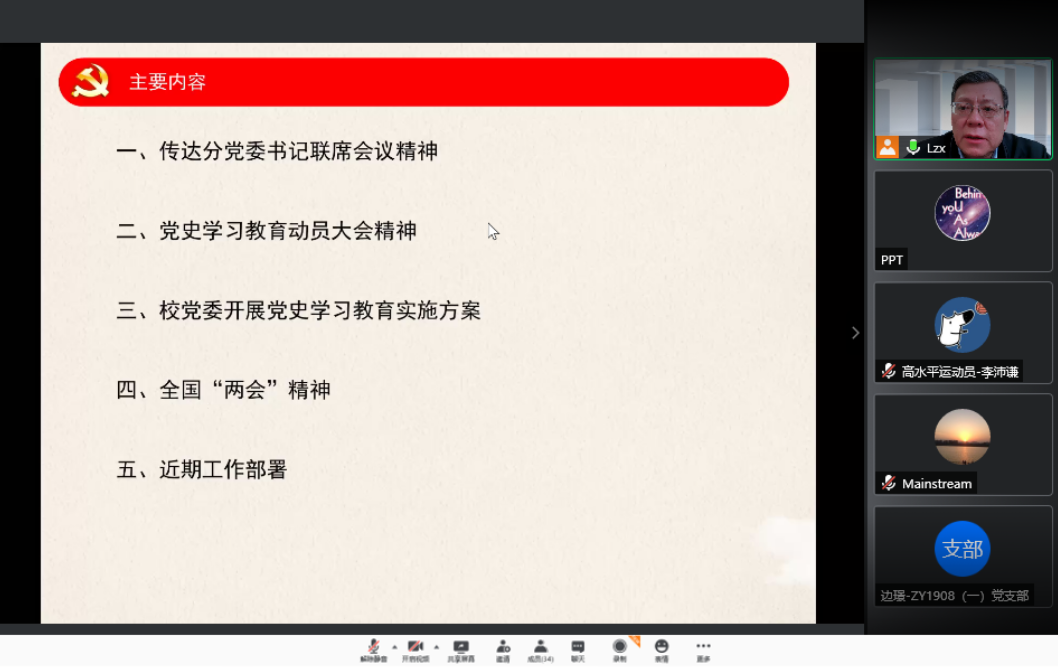 在学习全国“两会”精神时,刘志新强调,各支部要坚持以习近平新时代中国特色社会主义思想为指导,深入了解党和国家的大政方针、“十四五”规划和2035宏伟蓝图,深刻把握两会精神实质和精髓要义,切实把两会精神落到实处。各支部在学习贯彻过程中,要充分挖掘校史、院史中的红色育人资源和文化资源,推动爱党、爱国、爱校的思想在广大师生中落地生根。要牢记立德树人的根本任务,坚持问题导向,求准而精,注重学习反馈,激发知行合力。