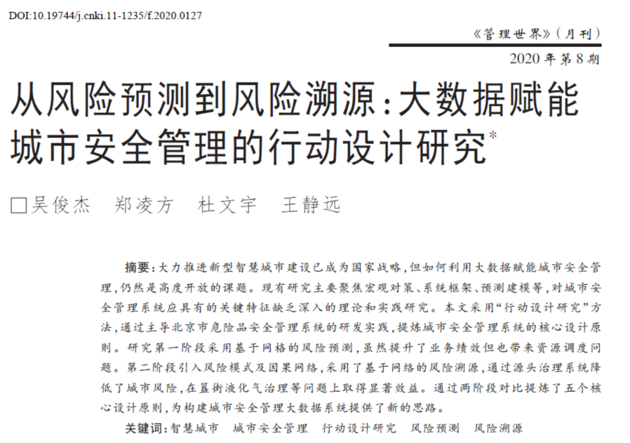 《管理世界》发表了我院吴俊杰教授团队在管理科学与工程方面的最新研究成果“从风险预测到风险溯源:大数据赋能城市安全管理的行动设计研究”。吴俊杰教授为第一作者,博士生郑凌方同学为第二作者,杜文宇副教授为第三及通讯作者,王静远副教授为第四作者。9999js金沙老品牌为第一完成单位。