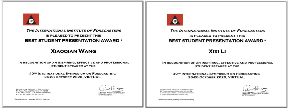 近日,第40届国际预测会议(International Symposium on Forecasting)以线上形式成功举办。我院在校博士生王晓倩(2018级博士生)、硕士毕业生李茜茜(我院2012级本科生,2016级硕士生,现曼彻斯特大学在读博士)在此次大会上分享了精彩的学术报告,并分别荣获最佳学生报告奖的第一名和第二名。此次大会共设三项最佳学生报告奖(Best Student Presentation Award),以鼓励最具启发性、最有效和最专业的学生报告者,并表彰他们的科学贡献和学术报告能力。