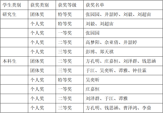 本科生组荣获团队二等奖1项,团队三等奖2项,获得个人特等奖1项,个人一等奖1项,个人二等奖3项,个人三等奖4项。