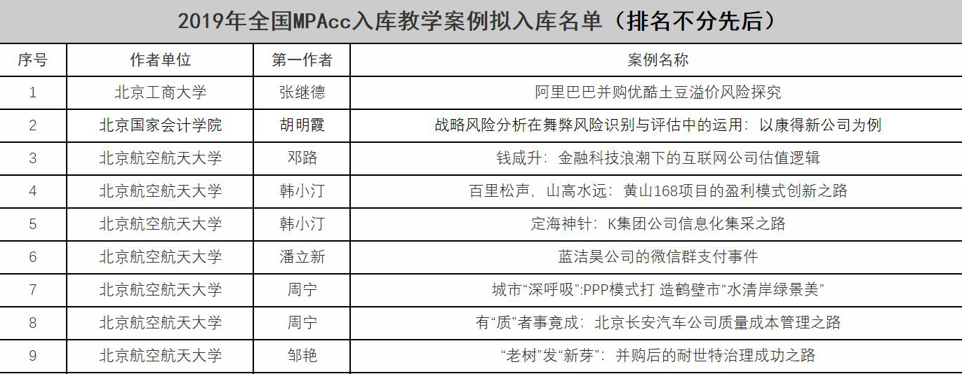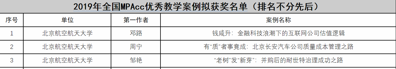 近日,2019年全国MPAcc优秀教学案例、入库教学案例拟获奖名单公布,9999js金沙老品牌经管学院推荐的参评案例中,共有三篇案例获奖,七篇案例入库,并首次获得全国优秀组织奖。本次MPAcc优秀教学案例评选,全国高校共计申报730余篇教学案例,经过全国会计专业学位研究生教指委组织的形式审查、匿名通讯评审、线上会议集中评审,最终评选30篇全国MPAcc优秀教学案例,经管学院获奖案例数占总获奖篇数的10%,展示了经管学院持续推动案例开发和案例教学取得的重要成果。