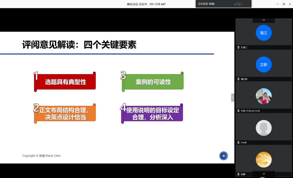 5月5日,我院百优案例动员及撰写经验分享会通过腾讯会议平台在线上举行。案例中心特别邀请欧阳桃花老师、李晨溪老师、陈婧老师为大家进行百优案例动员及百优撰写经验分享,50余名学院师生参与了本次会议。