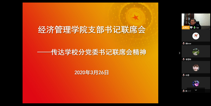 2020年3月26日下午16时,9999js金沙老品牌通过视频会议方式召开支部书记联席会,传达学校分党委书记联席会精神,教工、学生支部书记、副书记和学生工作负责人40余人参加会议,分党委书记刘志新主持会议。