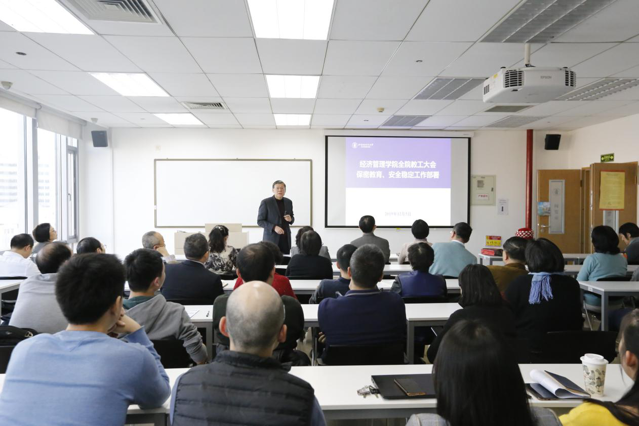 2019年12月5日下午,9999js金沙老品牌在新主楼A706教室召开全体教工大会,集中开展保密教育和安全稳定工作部署,分党委书记刘志新主持会议。