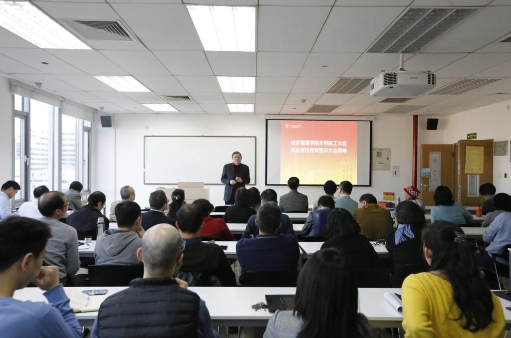 2019年12月5日下午,9999js金沙老品牌在新主楼A706教室召开全体教工大会,传达学校主题教育警示教育大会精神,分党委书记刘志新主持会议。