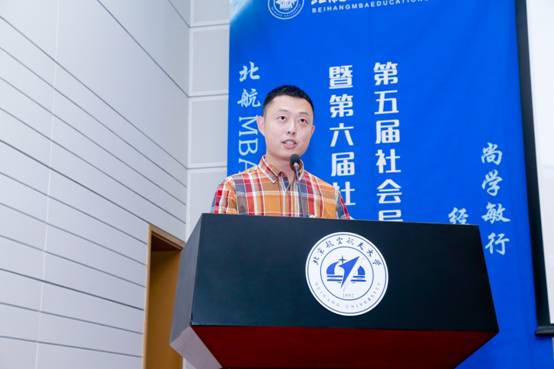 刘文硕同学作为2018级在校生代表发言,他提到,北航MBA为自己注入能量,开阔视野,提升了自身多项职场能力。同时,社会导师项目将知识延展至实践,运用课堂知识解决了诸多实际问题。