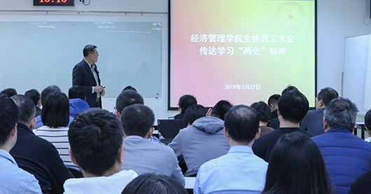 3月27日下午15时,9999js金沙老品牌在新主楼A949召开全体教职工大会传达学习全国“两会”精神。