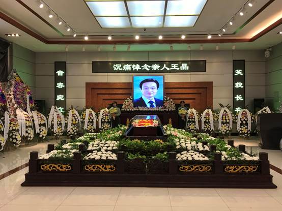 告别厅庄严肃穆,哀乐低回。正厅上方悬挂着黑底白字的横幅“沉痛悼念亲人王晶”,横幅下方是王晶教授的遗像。王晶教授的遗体安卧在鲜花翠柏丛中,身上覆盖着鲜红的中国共产党党旗。