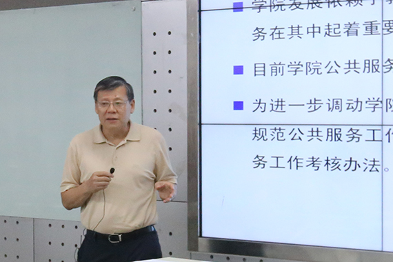 分党委书记刘志新作了关于专任教师公共服务考核专题报告。刘书记从公共服务考核的基本原则、公共服务工作核定、考核与实施等方面进行了详细的解读。他强调,学院的发展依赖于教学科研、学科建设和人才培养,公共服务在其中起着重要的辅助作用,希望全体教师积极参与。