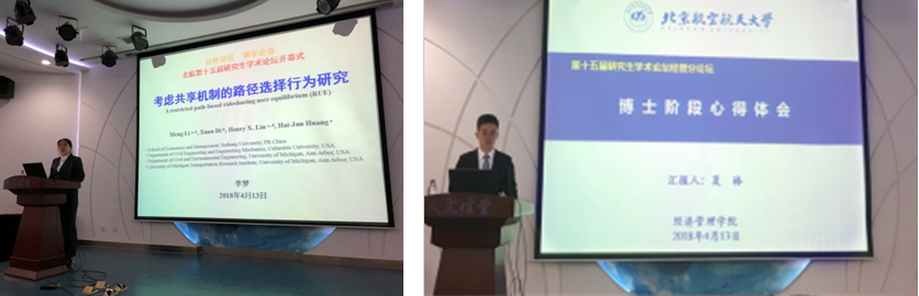 最后,优秀博士生代表——李梦和夏棒同学分别就“考虑共享机制的路径选择行为研究”以及“博士阶段心得体会”与在场师生进行了交流。李梦同学以自己的论文为例,向师生们展示了自己的研究成果,并简要概括了发表论文的要点。夏棒同学就课程学习、论文发表等方面向同学们进行了详细的介绍。