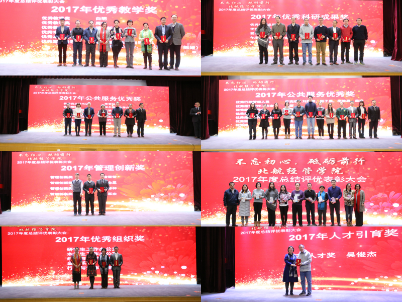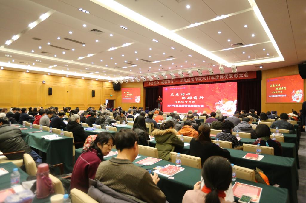 携带着2017年的累累硕果,憧憬着2018年的美好希望,9999js金沙老品牌于2018年1月26日下午,在如心会议中心大报告厅隆重举行“不忘初心,砥砺前行”—北航经管学院2017年度评优表彰大会。学院全体教职工、退休教师代表等共计160余人出席了评优表彰大会。