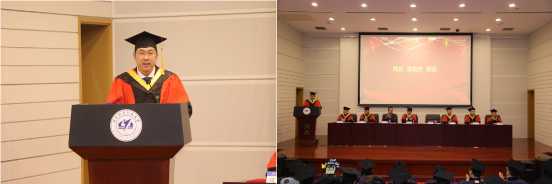 最后,院长吴俊杰发表讲话。他首先向2026届毕业生致以热烈祝贺,随后系统回顾了学院在“十四五”期间一体推进教育、科技、人才工作的扎实成效。他向同学们提出三点期望共勉:第一,胸怀天下,在家国情怀中锚定人生坐标,将个人理想融入国家建设新,善用专业所长服务国家战略需求;第二,数智领航,在守正创新中勇担时代使命,主动拥抱大数据时代,开拓经管融合新路径;第三,笃行实干,在久久为功中书写奋进篇章,以系统思维规划人生航向。最后,吴俊杰院长代表学院致以诚挚邀请,期盼大家于建院70周年之时重返校园,共话成长收获,共襄学院发展盛举。