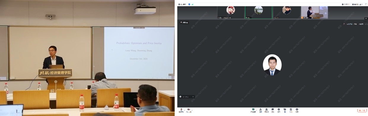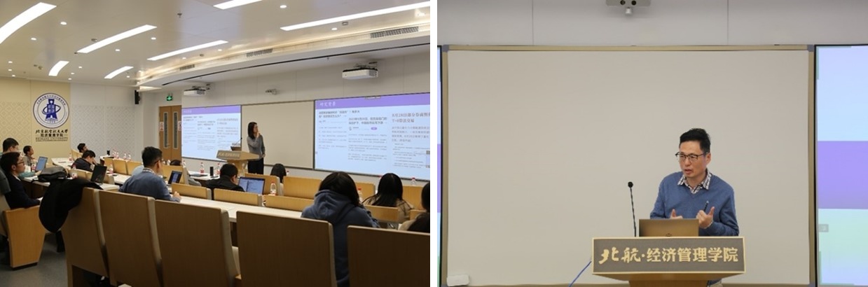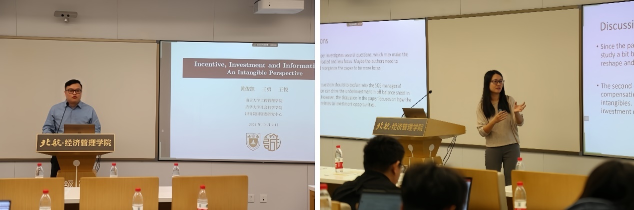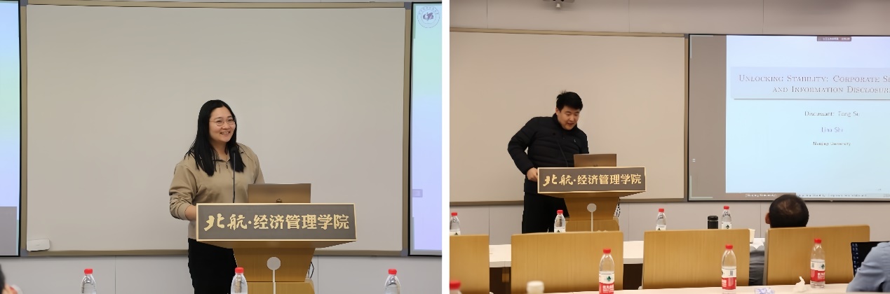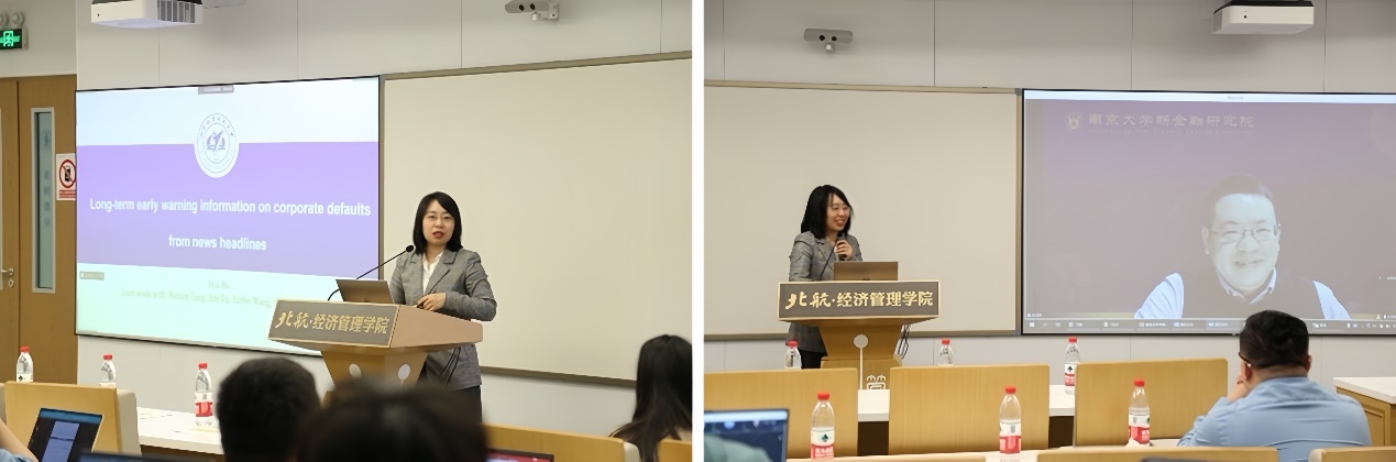 第一半场的学术交流邀请了三个学术报告,并由评论人对论文进行了点评。北航经管金融系的部慧副教授做了题为“Long-term early warning information on corporate defaults from news headlines”的学术报告,该研究工作主要是探究新闻标题在预测公司债券违约中的信息价值和能力。南京大学工程管理学院教授、新金融研究院副院长肖斌卿教授对该论文进行了点评。南京大学工程管理学院工程管理学院金融科技与工程系黄俊凯副研究员做了题为“Incentive, Investment and Informativeness: An Intangible Perspective”的学术报告,该论文主要是从表外无形资产的角度研究国企高管薪酬激励与投资决策和股价低估之间的关系。北航经管金融系洪洁瑛副教授对这篇论文进行了点评。北航经管金融系石丽娜助理教授做了题为“Unlocking Stability: Corporate Site Visits and Information Disclosure”的学术报告,该报告从信息披露的角度验证了实地调研稳定市场的效应及机制。南京大学工程管理学院苏彤副研究员对这篇论文进行了点评。上半场的学术论文交流由北航经管金融系吴蕾副教授主持。