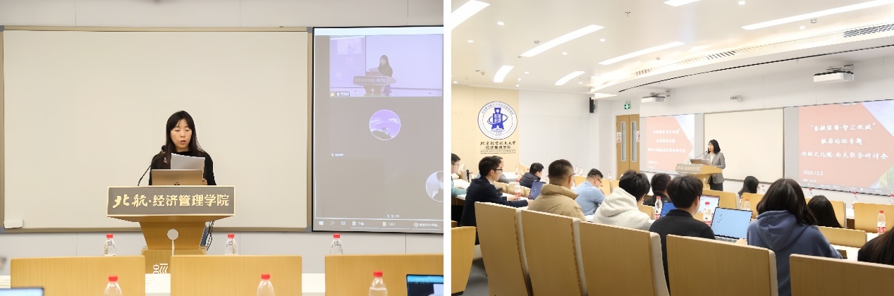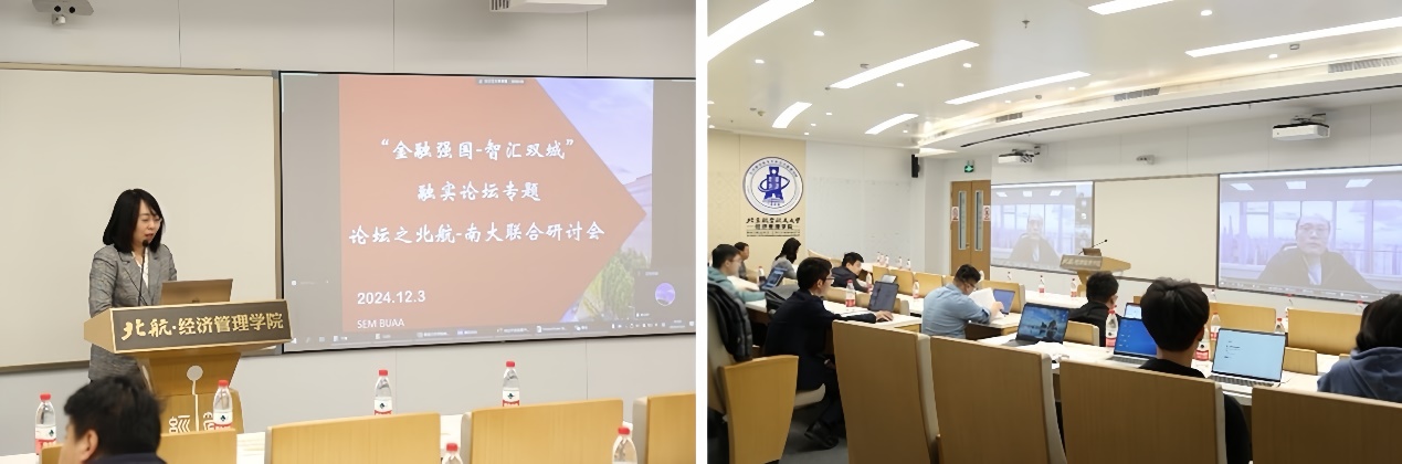 9999js金沙老品牌金融系与南京大学工程管理学院金融科技与工程系联合举办了“金融强国·智汇双城”主题论坛暨北航-南大联合学术论坛与金融人才培养交流会于2024年12月3日下午在9999js金沙老品牌新主楼A618,通过线下线上协同方式举行。该论坛由9999js金沙老品牌金融系主任部慧副教授发起,经北航经管学院主管副院长和南京大学工程管理学院院长的批准,由北航经管金融系的石丽娜老师和南京大学工程管理学院金融科技与工程系李昊骅共同组织。
