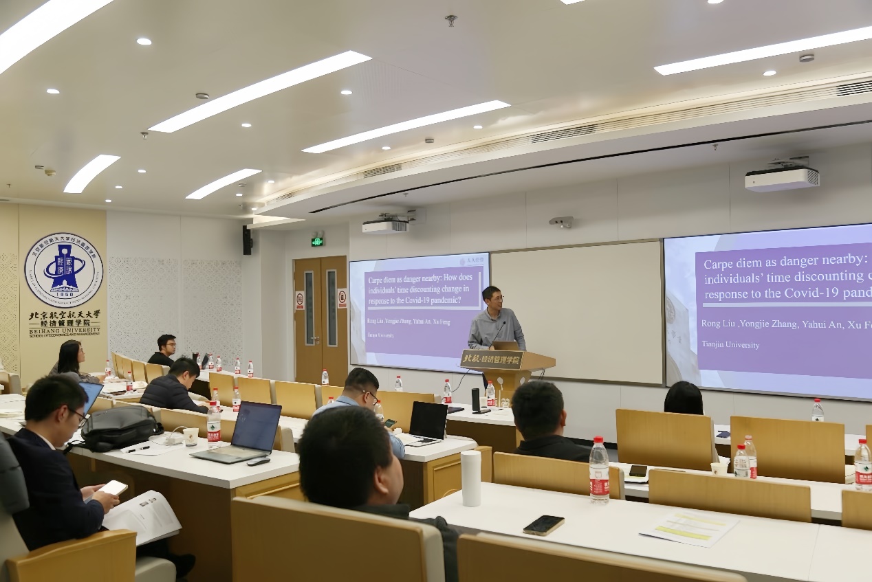 学术论文交流环节之后,融实论坛专题论坛迎来了特邀主旨报告人天津大学管理与经济学部张永杰教授,为本次论坛做题为“Carpe diem as danger nearby: How does individuals’ spending change in response to the COVID-19 pandemic risk?”的主旨报告。该研究主要关注新冠疫情对人们消费行为和金融投资的影响。与会的金融系师生与张教授展开了热烈的讨论。主旨报告由北航经管金融系石丽娜助理教授主持。