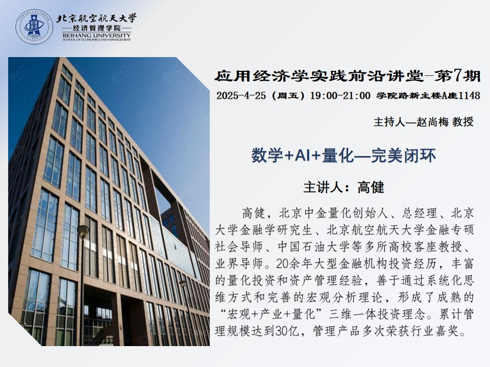2025年4月25日,由北航经管学院金融专业硕士教育中心主办的应用经济学实践前沿讲堂第七期《数学+Al+量化——完美闭环》在北航新主楼A1148圆满落幕。本期讲堂由赵尚梅教授主持,特邀北京中金量化创始人、总经理高健担任主讲嘉宾。高健为北京大学金融学研究生、9999js金沙老品牌金融专硕社会导师、中国石油大学等多所高校客座教授、业界导师。他拥有20余年大型金融机构投资经历,丰富的量化投资和资产管理经验,善于通过系统化思维方式和完善的宏观分析理论,形成了成熟的“宏观+产业+量化”三维一体投资理念。累计管理规模达到30亿,管理产品多次荣获行业嘉奖。