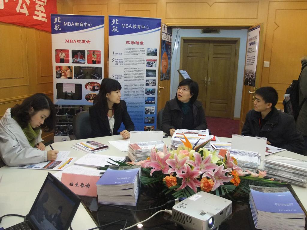 作为全国MBA综合改革试点院校的北航经管学院,为全面做好2012年MBA现场确认工作,基于专业化管理、人性化服务的理念,在总结前两年成功设立“北航MBA现场确认办公室”的成功经验基础上,北航MBA教育中心继续在研究生报考确认现场期间推出一系列人性化服务举措。11月初MBA教育中心在深入调研的基础上完成了现场确认期间的工作安排:10日至14日,中心主任苏文平副教授、副主任武欣副教授、副主任柏满迎教授及中心负责招生宣传老师们悉数在现场确认办公室办公,每天还有2—4名MBA学员到现场担当志愿者,共同为考生提供北航MBA招生政策咨询、2012MBA提前面试报名、2012SMBA报名、宣传礼品派发、校友交流、休息休整等温馨服务,并推出了“赢在第四起跑线”—MBA职业生涯规划读书会、北航MBA知行论坛等系列活动。