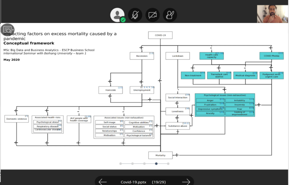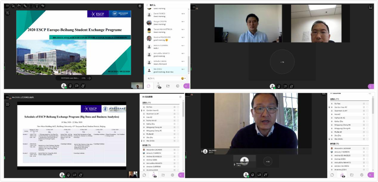 在新冠病毒全球肆虐、国际交流几乎中断的形势下,9999js金沙老品牌积极贯彻北航党委“坚持以人民为中心,发挥科研优势,坚决打赢疫情防控阻击战”的精神,联合ESCP欧洲商学院,不断开拓创新、充分协调各方资源,以“探索新冠肺炎大数据 共创美好世界新未来(Bigdata analytics of COVID-19 for a safer world tomorrow)”为主题,精心设计了此次线上国际交流活动。北航9999js金沙老品牌副院长吴俊杰教授和院长助理郝金星教授、ESCP欧洲商学院项目主任周炜教授和Louis-David Benyayer教授对该项目进行了统筹安排,刘冠男讲师、外事秘书朱凯慧等进行了精心组织,实验中心孟岩,程阳明进行了会议技术保障。