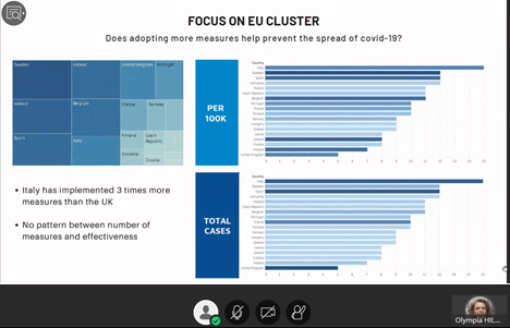 此次线上国际交流活动还进行了“新冠肺炎大数据”数据挑战赛,5天、13个小组、80名ESCP商学院国际学生积极参与并进行了线上答辩。学生通过综合应用课堂中学习到的机器学习、时间序列、计量经济、优化建模等方法,系统开展了Covid-19大数据的挖掘与分析,取得了丰硕的阶段性成果。这些成果大致分为三个方面。围绕疫情影响,研究了疫情对全球经济、比特币交易、失业率、社会不平等现象等的作用机理;围绕政府抗击疫情的措施,探究了居民对于政府措施的服从程度、措施实行的范围时长、不同国情导致措施的差异化等对于对病毒传播率、死亡率的影响;围绕疫情中的社会现象,指出社会中存在抗疫资源分配不平等、民众从众心理下的出行差异以及抢购、解禁后女性感染率上升等现象。此次在线数据挑战赛,也体现了不同文化背景下的思想交流碰撞。同学们纷纷表示此次线上挑战赛不仅开拓了自身学术视野、检查了自身学习效果,而且体验了自身研究成果所带来的丰收与喜悦。