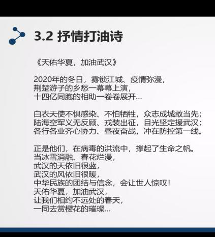 武慧慧同学分享了她在防疫抗疫的工作中的三点心得体会:奉献、行动和信心。作为抗击疫情的后勤工作者,武慧慧同学认为我们应当要对医务人员的贡献心存感激,做好自己力所能及的工作,奉献自身的能量,哪怕只做出一点点的贡献,并且要保持信心,坚信我们能够打赢抗击疫情的阻击战。同时,她也提到随着园区内企业逐步复工复产,园区人口流动增加,防疫工作面临着重大的挑战,但她依然会保持信心,积极行动,奉献自身的能量,完成本职工作。最后她借用习近平总书记的讲话,鼓励大家要有奉献意识,有行动力,有信心,成为新时代的追梦人。