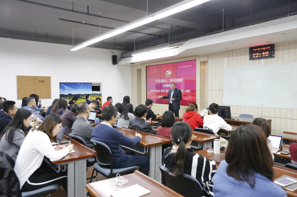 2019年10月31日中午,9999js金沙老品牌分党委书记刘志新和院长兼分党委副书记范英在新主楼A622教室结合学习调研情况讲授主题教育专题党课,全体教工支部支委、学生支部书记和学生工作负责人60余人聆听党课,学校“不忘初心、牢记使命”主题教育第十巡回指导组成员蒋茁到会指导。