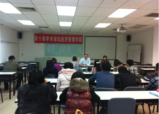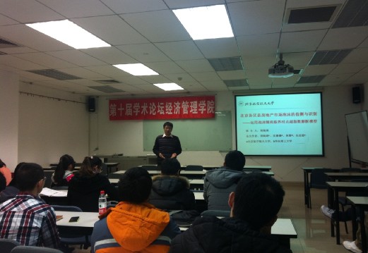 2013年11月27日晚上,北航经管学院保险与风险管理系郑海涛副教授应邀参加第十届学术论坛,在新主楼A1048为经管学院师生做了题为“北京各区县的房地产泡沫预测分析”的报告,研一的同学们怀着崇敬之情前来聆听了此次讲...